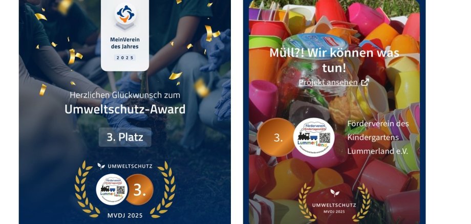 In diesem Zusammenhang wurden auch wir geehrt und sind so unheimlich glücklich und stolz, dass wir mit unserem gemeinsamen Projekt von KiTa und Förderverein "Müll?! Wir können was tun!" mit Platz 3 in der Kategorie Umweltschutz ausgezeichnet wurden.