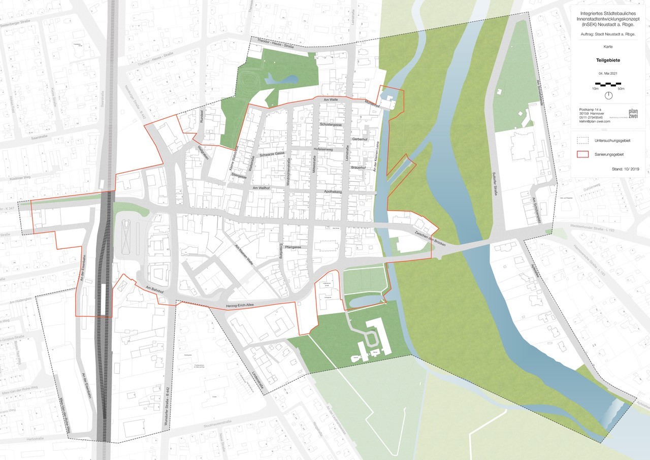 Die Innenstadt Neustadts soll als lebendiger, gesellschaftlicher Mittelpunkt der Stadt belebt und gestärkt werden. Zeitgemäße Einkaufs-, Versorgungs-, Erlebnis- und Wohnangebote für Bürgerinnen und Bürger sowie Besucherinnen und Besucher sind dafür die Voraussetzung. Es müssen weitere Impulse zur Stärkung von Einzelhandel und Tourismus, aber auch für die Aufwertung des Wohnstandortes gesetzt werden. Ein attraktiver öffentlicher Raum bildet hierfür den Rahmen. Die kreative Nutzung der vielfältig vorhandenen Potenziale und die Zusammenarbeit der engagierten Akteure ist Voraussetzung für den Erfolg. Starke Entwicklungsimpulse wie der Bau des neuen Rathauses in der Innenstadt oder die Errichtung eines neuen Einzelhandels- und Gewerbekomplexes vor dem Bahnhof bieten in den nächsten Jahren die Chance, die Innenstadt zukunftsfähig weiterzuentwickeln.