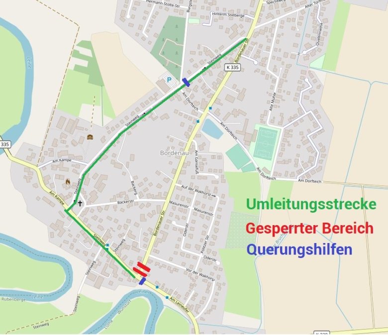 Fußgänger und Radfahrer sind von der Sperrung der Bordenauer Straße nicht betroffen und können den Baustellenbereich passieren. Am Steinweg wird auf Höhe der Einmündung in den Burgsteller Weg ein provisorischer Zebrastreifen aufgebracht.