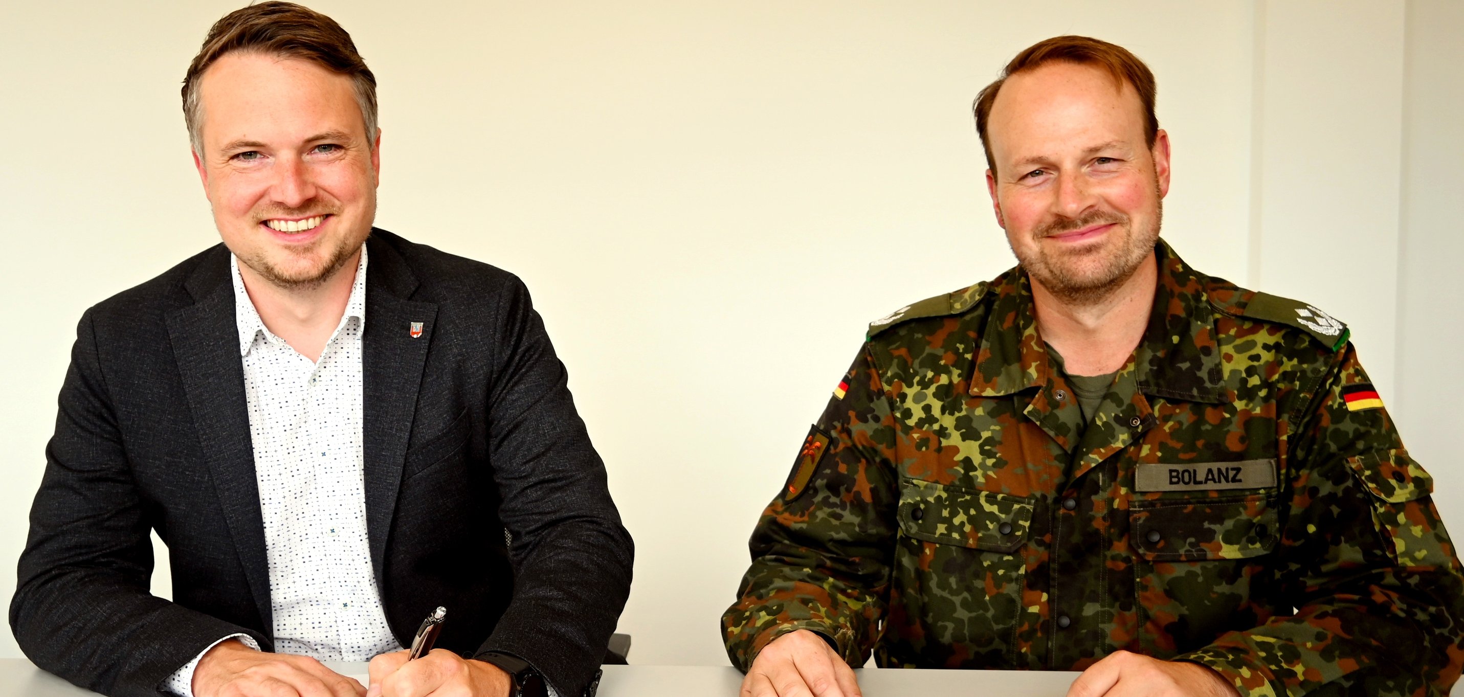 Nahaufnahmke der Flagge mit dem Stadtwappen Hintergrund blau-weiß