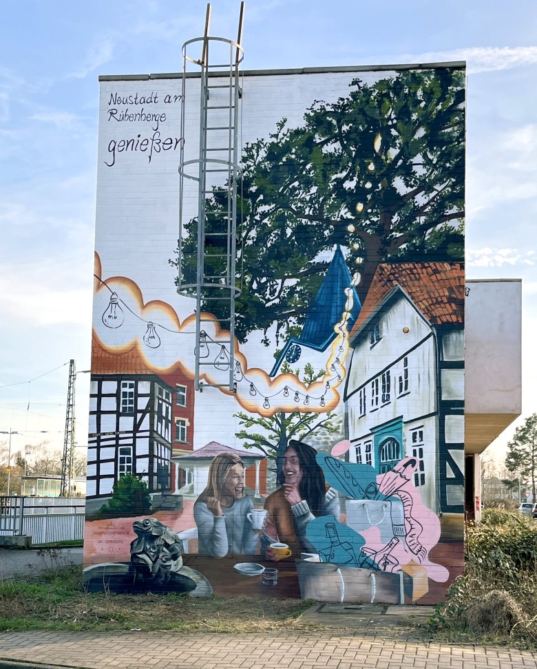 Die beiden Graffiti zusammen mit den beiden Bildern auf Alu-Dibond-Platten aus dem Gymnasium Neustadt a. Rbge., deren Themen vom Stadtschülerrat vorgegeben wurden, soll sich das Gebäude langsam in eine stetig wachsende Kunstgalerie verwandeln.